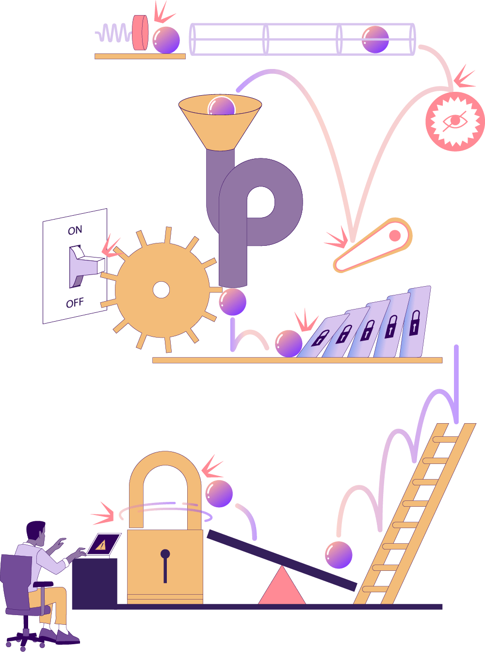 a playful illustration conveying the chain reaction of automated securities involved in enabling or disabling multiple access permissions.